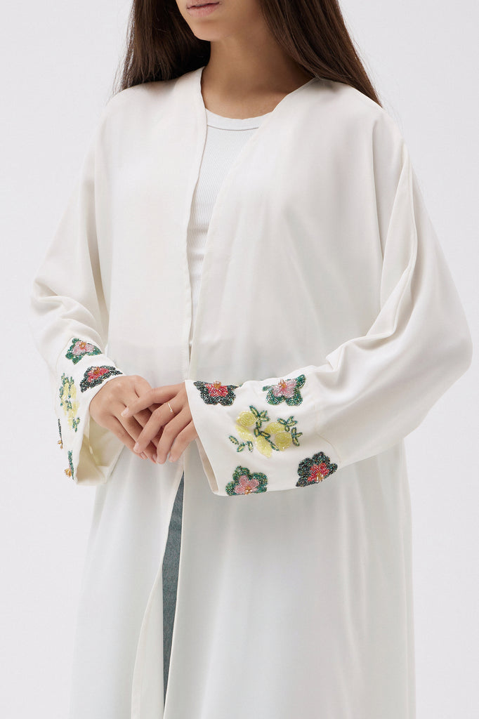 Élégance et raffinement se rencontrent avec notre sublime abaya écru en niddah coréen, une pièce délicate conçue pour sublimer votre silhouette avec douceur et légèreté. Son tissu fluide et soyeux offre un tombé parfait, tandis que les manches sont sublimées par un détail enchanteur de perles en forme de fleurs et de citrons, ajoutant une touche d’originalité et de finesse.