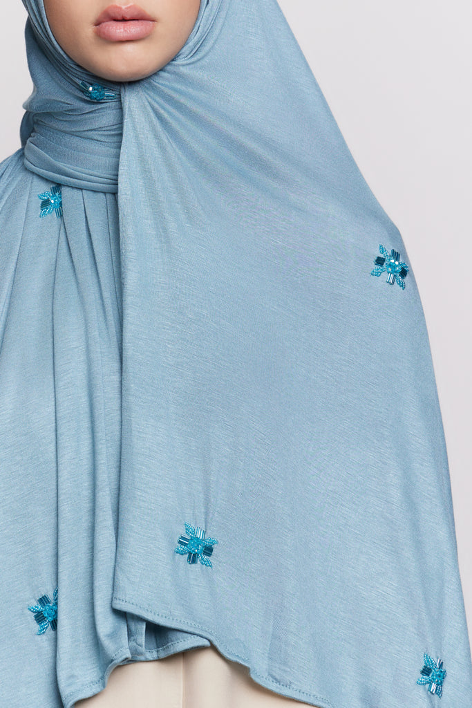 Découvrez notre Hijab en jersey Diamond Azur orné de perles en cristaux pour un look élégant et luxueux. En plus d'ajouter une touche de glamour à votre tenue, ce hijab est également confortable et facile à porter.