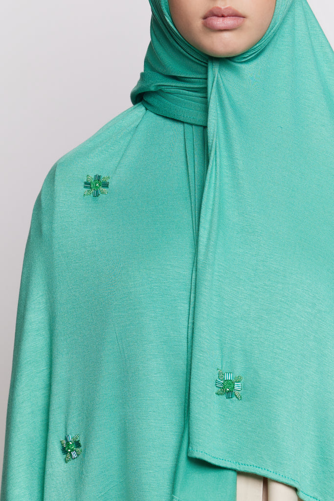 Découvrez notre Hijab en jersey Diamond Vert Jade orné de perles en cristaux pour un look élégant et luxueux. En plus d'ajouter une touche de glamour à votre tenue, ce hijab est également confortable et facile à porter.