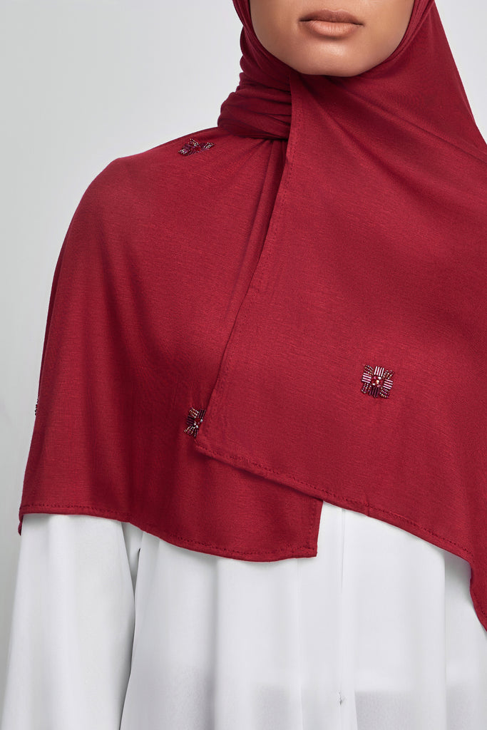 Découvrez notre Hijab en jersey Diamond Bordeaux orné de perles en cristaux pour un look élégant et luxueux. En plus d'ajouter une touche de glamour à votre tenue, ce hijab est également confortable et facile à porter.