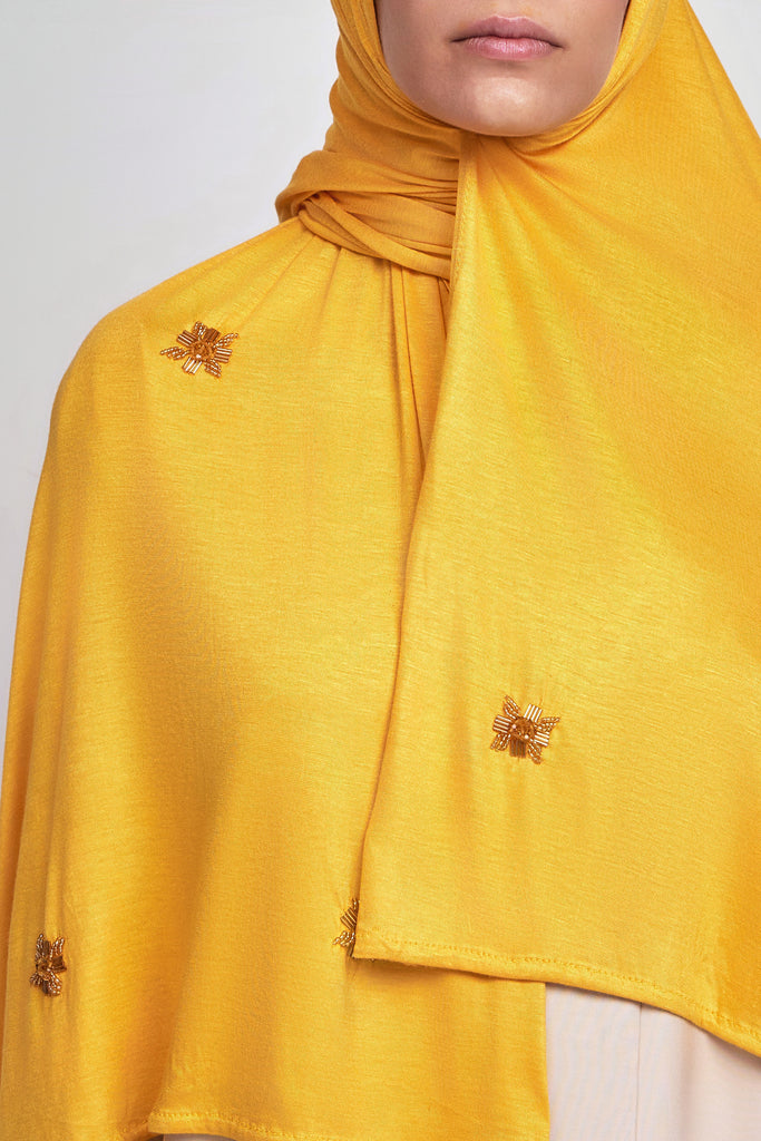 Découvrez notre Hijab en jersey Diamond Jaune orné de perles en cristaux pour un look élégant et luxueux. En plus d'ajouter une touche de glamour à votre tenue, ce hijab est également confortable et facile à porter.